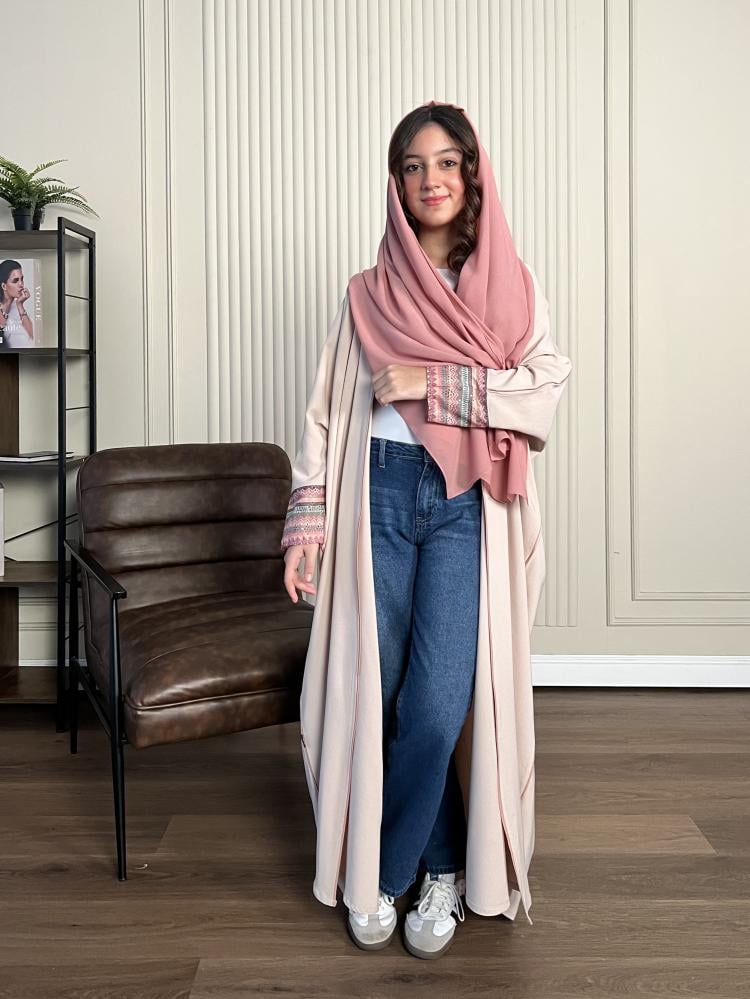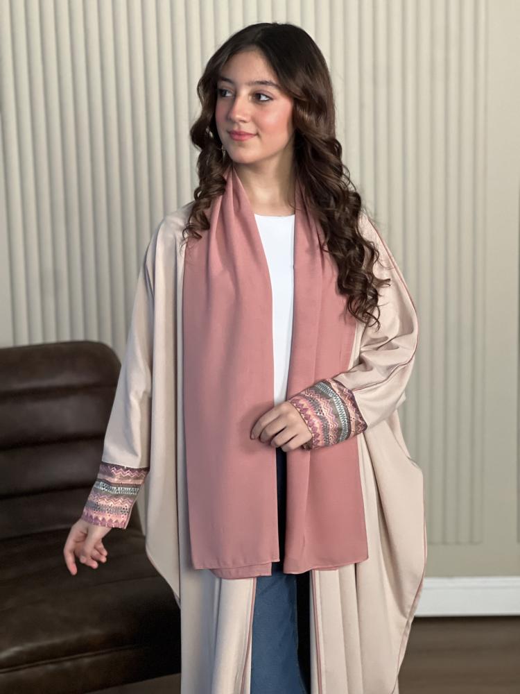 التصنيف: عبايات السن المحيراللون: بيجالقماش: تيواني بأكمام ملونه وقيطان ورديالقصه : نص بشتالموديل: D65